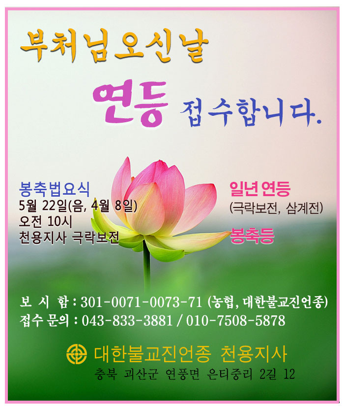 대한불교진언종 천용지사(충북 괴산 연풍) 연등 접수합니다.1059 | 2018. 04. 25
